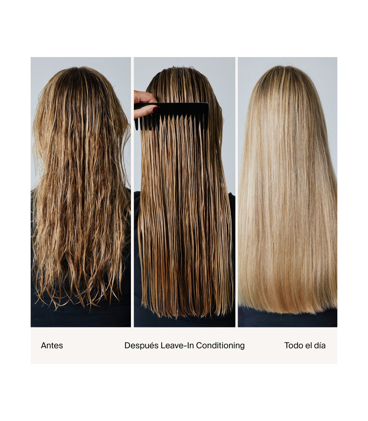 Agita bien. En el cabello limpio y húmedo, rocía desde la raíz hasta las puntas, enfocándote en las áreas enredadas. Peina para distribuir. Estiliza como de costumbre.